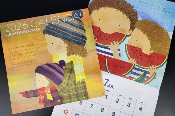 オガサワラユウダイさんの2026年版カレンダーが入荷しました。今年も心温まる12枚の書下ろしイラストは偉人の名言をもとに描かれています。1260円(税込)
